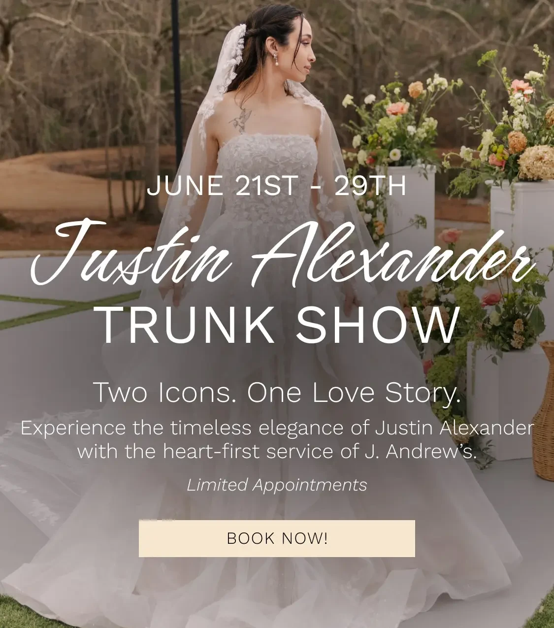 “From the moment I walked into J. Andrew’s Bridal, I knew I was somewhere special. The warm, welcoming energy and amazing people made finding my dream gown one of the most memorable parts of my wedding. My stylist made me feel comfortable, listened to everything I envisioned, and guided me to 'the one' without ever making me feel rushed or overwhelmed. Trying on gowns wasn’t just shopping — it was a celebration. Every moment felt exciting, emotional, and personal. When I put on my dress, everything clicked. I truly felt like a bride. What made it even more special was how genuinely happy and supportive the team was. From the stunning gown selection to the incredible care, every part of the experience was exceptional. J. Andrew’s didn’t just help me find a dress — they helped me feel confident, beautiful, and completely myself. I’m forever grateful.“